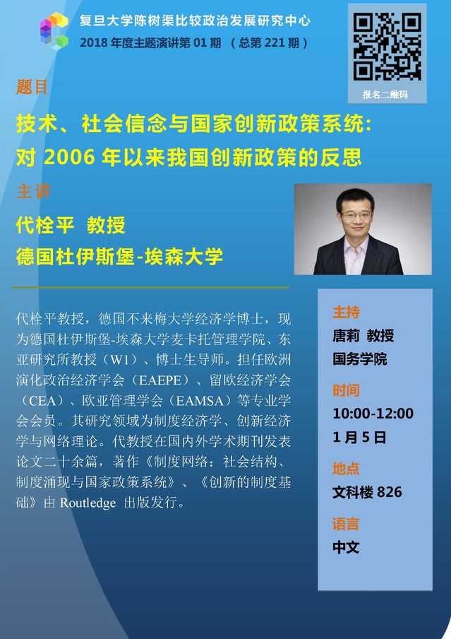 讲座信息:代栓平教授主讲“技术、社会信念与国家创新政策系统”(1月5日)