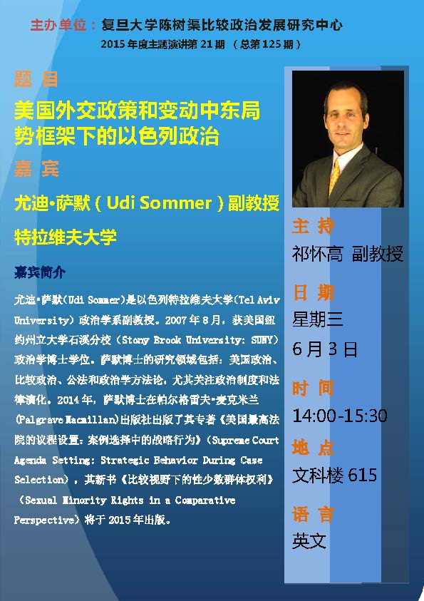 讲座信息:美国外交政策和变动中东局势框架下的以色列政治(6月3日)