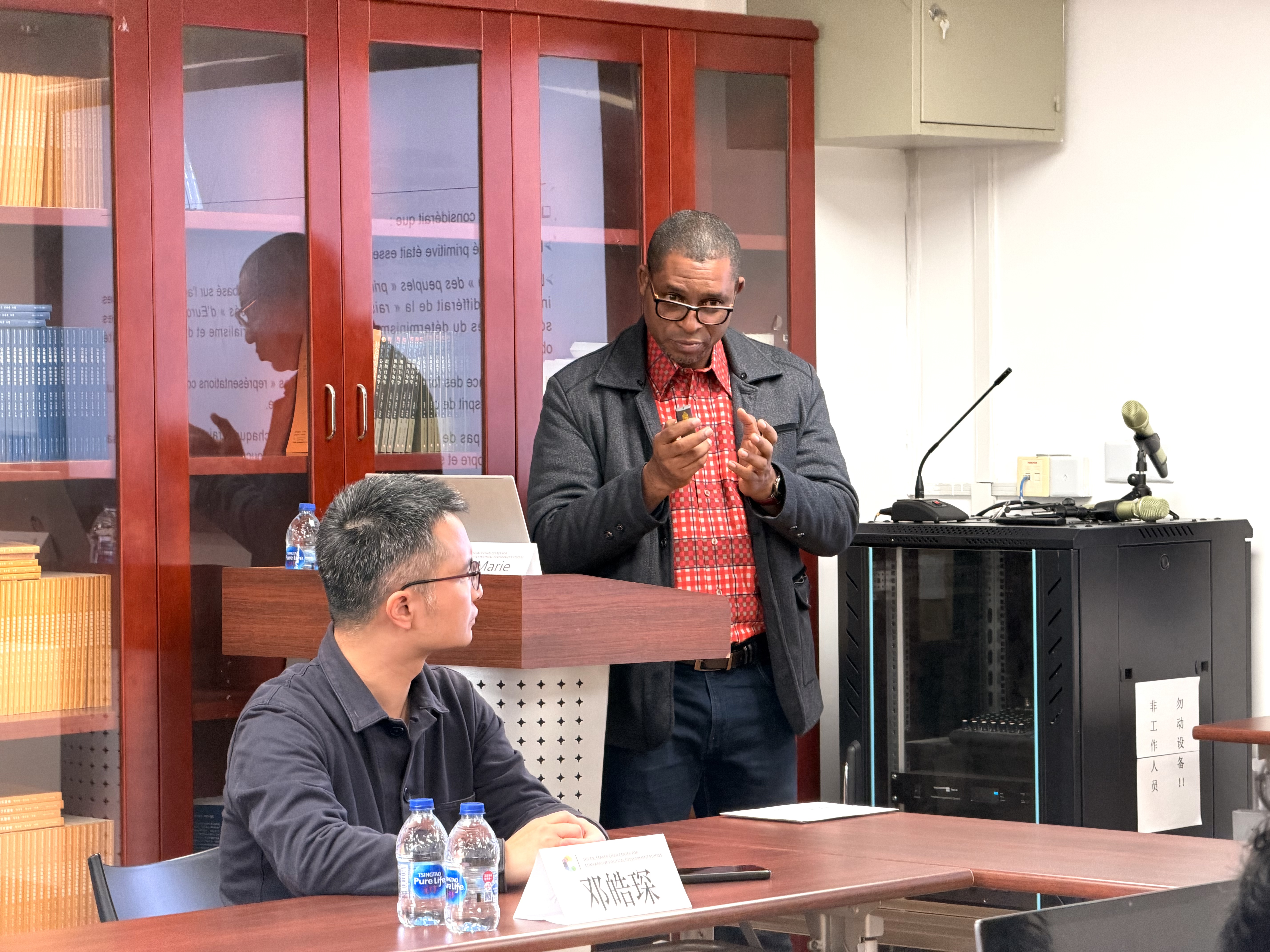 2025年11月20日,复旦大学陈树渠比较政治发展研究中心举办的年度主题演讲第25期(总第394期)在文科楼424会议室成功举行。喀麦隆马鲁阿大学哲学系副教授、复旦发展研究院访问学者莱昂·玛丽·恩科洛·恩乔多(Léon-Marie Nkolo Ndjodo)受邀以“非洲当代思想演变”为主题发表学术演讲。讲座由复旦大学国务学院邓皓琛讲师主持,现场提供中文翻译,吸引了众多师生积极参与。