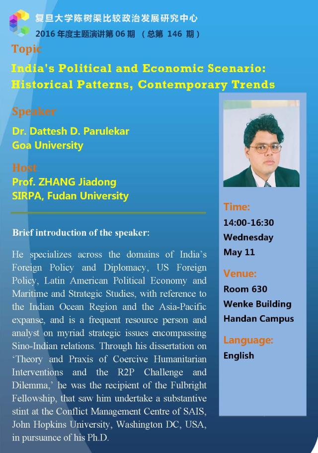 讲座信息:Dattesh D. Parulekar主讲“India's Political and Economic Scenario: Historical Patterns, Contemporary Trends”(5月11日)