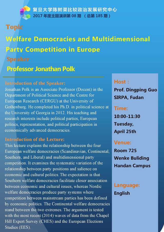 讲座信息:Jonathan Polk 主讲“Welfare Democracies and Multidimensional Party Competition in Europe”(4月25日)