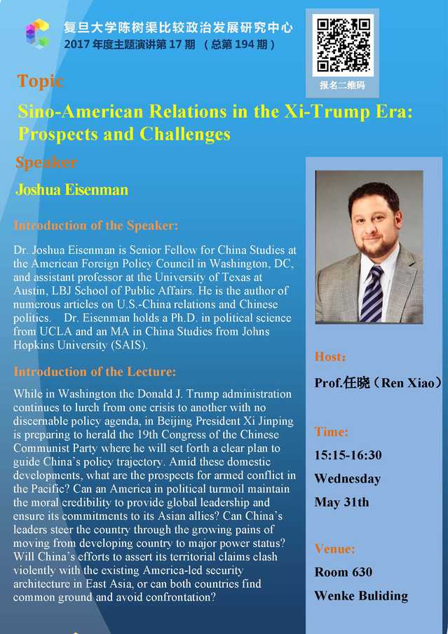 讲座信息:Joshua Eisenman主讲“Sino-American Relations in the Xi-Trump Era:Prospects and Challenges”(5月31日)