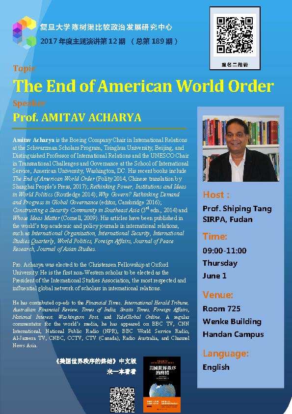 讲座信息:Amitav Acharya主讲“The End of American World Order”(6月1日)