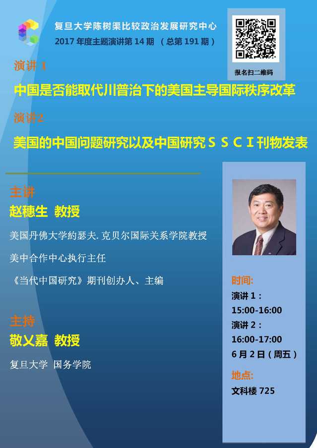 讲座信息:赵穗生主讲“中国是否能取代川普治下的美国主导国际秩序改革”和“美国的中国问题研究以及中国研究SSCI刊物发表”(6月2日)