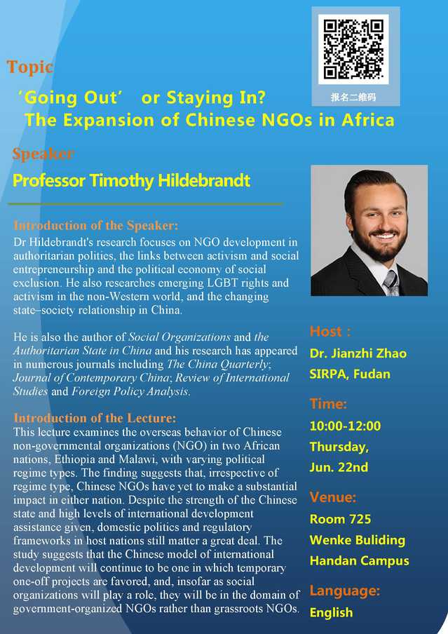 讲座信息:Timothy Hildebrandt主讲“Going Out”or Staying In?The Expansion of Chinese NGOs in Africa(6月22日)