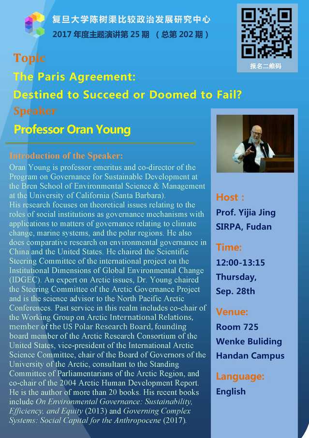 讲座信息:Oran Young主讲“The Paris Agreement: Destined to Succeed or Doomed to Fail?”(9月28日)
