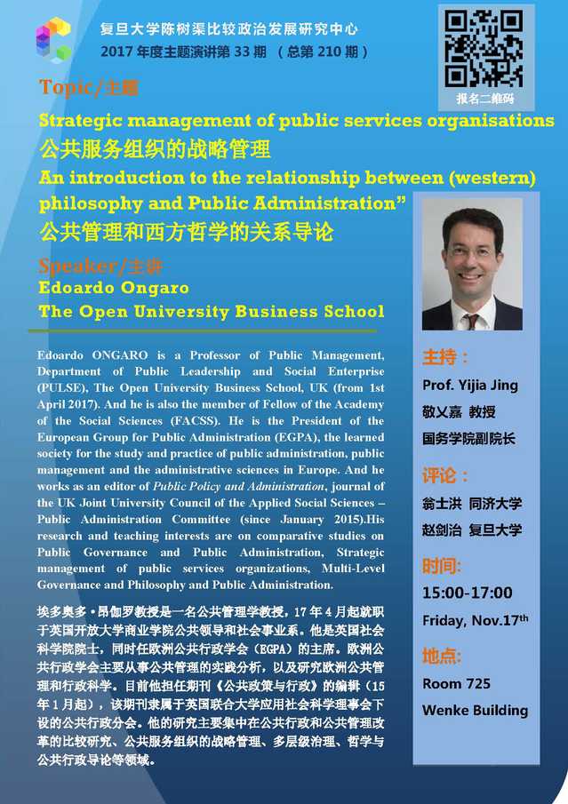 讲座信息:Edoardo Ongaro教授主讲“Strategic management of public services organisations”和“An introduction to the relationship between (western) philosophy and Public Administration”