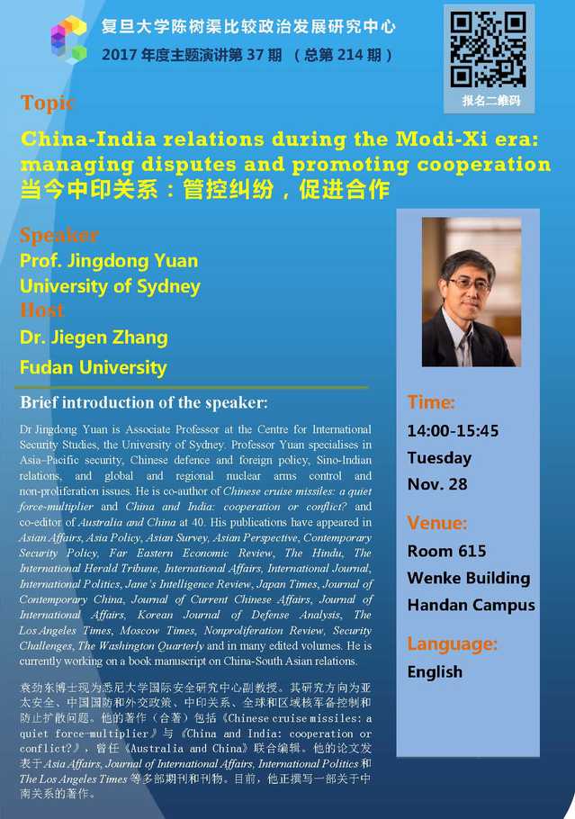 讲座信息:袁劲东教授主讲“China-India relations during the Modi-Xi era: managing disputes and promoting cooperation”