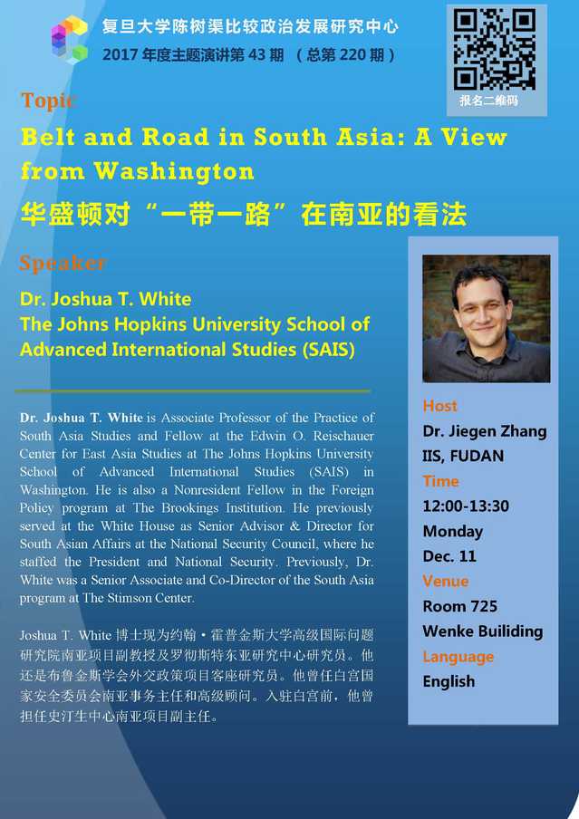 讲座信息:Joshua White主讲“Belt and Road in South Asia: A View from Washington”(12月11日)